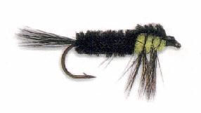 - Take the black body chenille over the thorax area to form the wingcase, secure and trim. Then form a neat head, whip finish, and varnish.