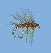 - Catch in the hackle with the oval gold tinsel which should be ribbed back up the body through the hackle to the eye where it is secured and trimmed.
